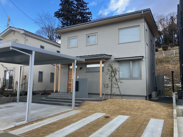 ライトグレーの外壁は塗装のコテ仕上げ、木製玄関や板張りの軒天井、化粧柱の自然な風合いも相まって優しい雰囲気となりました。