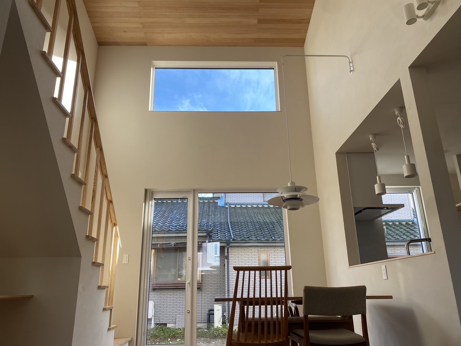 吹き抜けの窓からも明かりが入り日中は十分な採光を得られております。日射の活用・調節、導光などパッシブデザインの要素です。