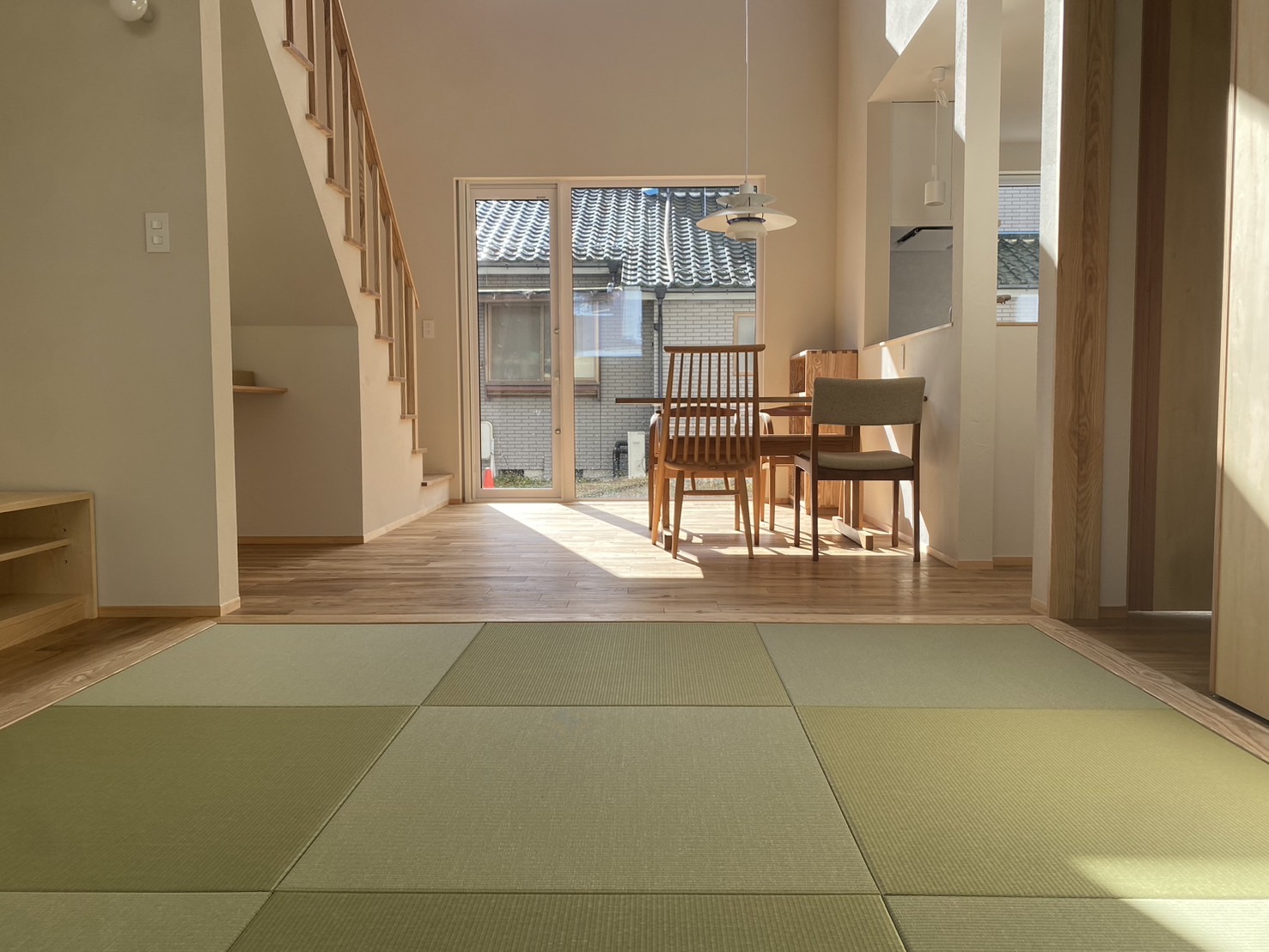 吹き抜けのあるダイニング、畳のリビングです。広々とした雰囲気と、籠り感のある空間を合わせました。