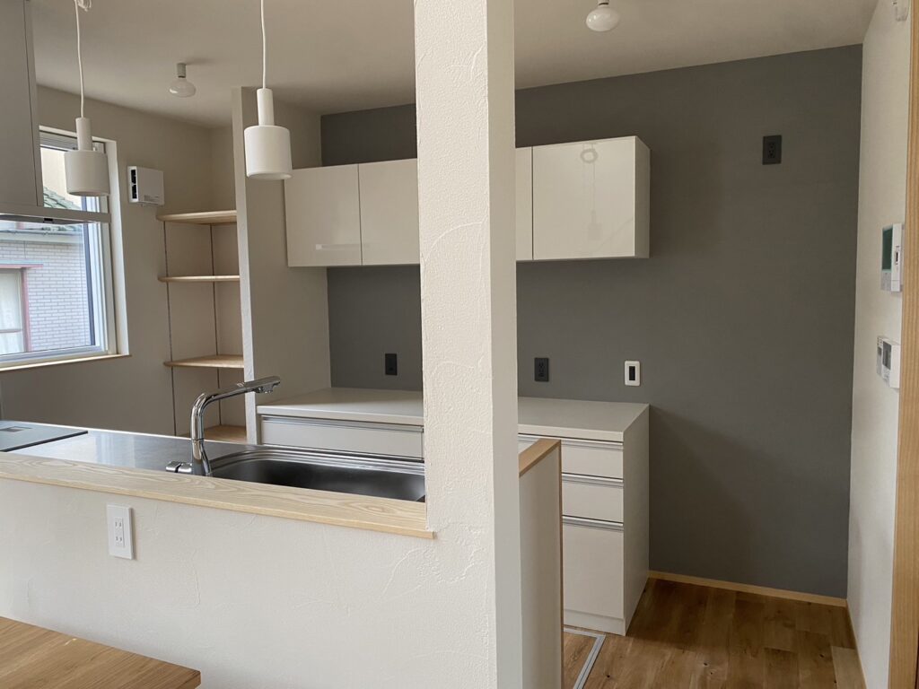 ホワイトのキッチン収納を選定していただきましたことからキッチンの背面は珪藻土のグレー、hyggeのイメージカラーでのアクセントを採用していただきました。