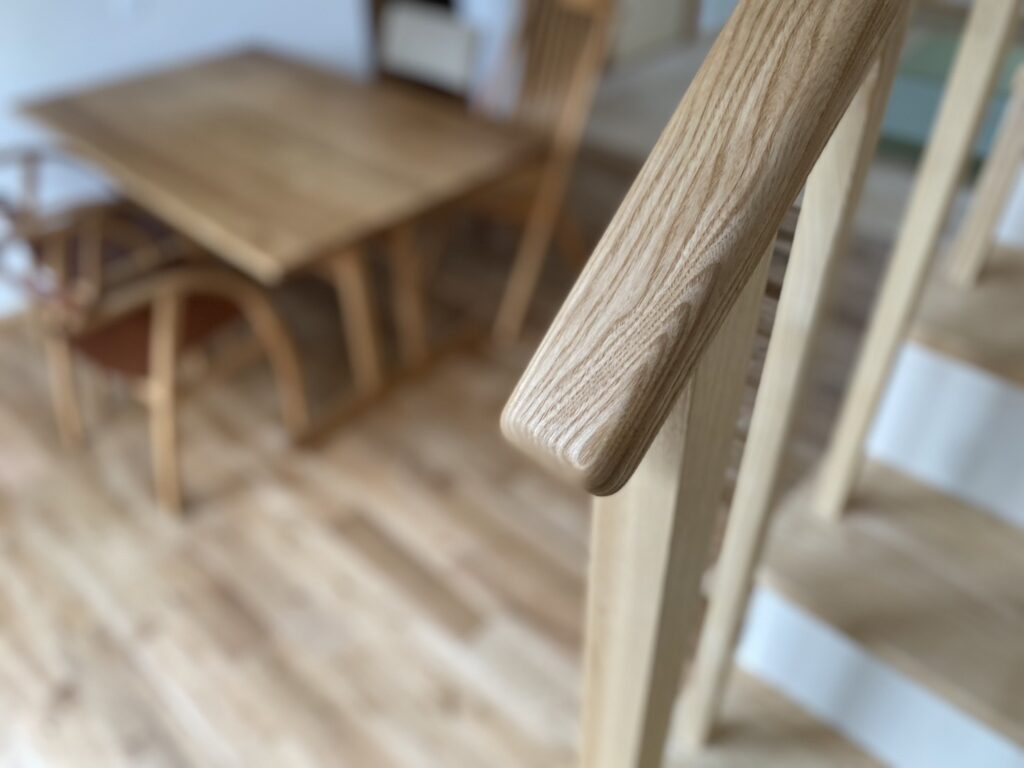 リビング階段の部材もホワイトアッシュ無垢材による造作、丁寧に加工していただいていることで手触りがとても良いです。