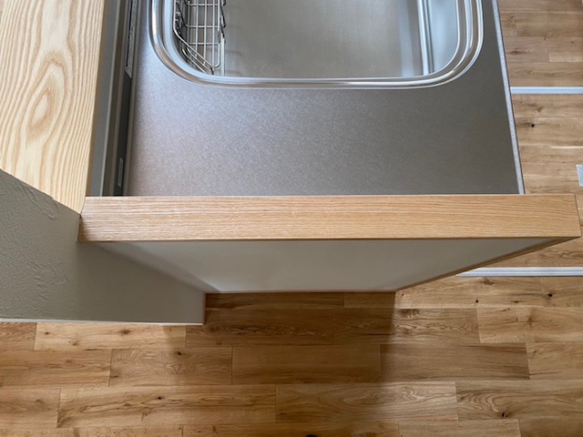 コンロ背面のパントリーにある棚板もホワイトアッシュ無垢板として、こうしたところまで統一感を持たせていただきました。