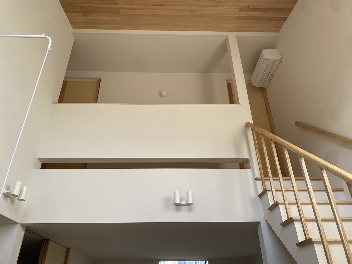 ホールに設置したエアコンは冷房用、吹き抜けの1番高いところに設置することで夏に温度の高い上昇した空気を吸気する意図です。