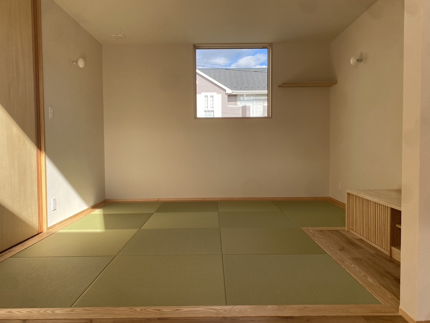 内装の窓枠は基本的に下枠のみとしてスッキリとした印象となるようにしておりますが、畳のリビングの窓は4方に枠を設けました。畳のまわりにある縁取りに合わせ、窓にも縁取りをしてデザインの統一感を考えたところです。