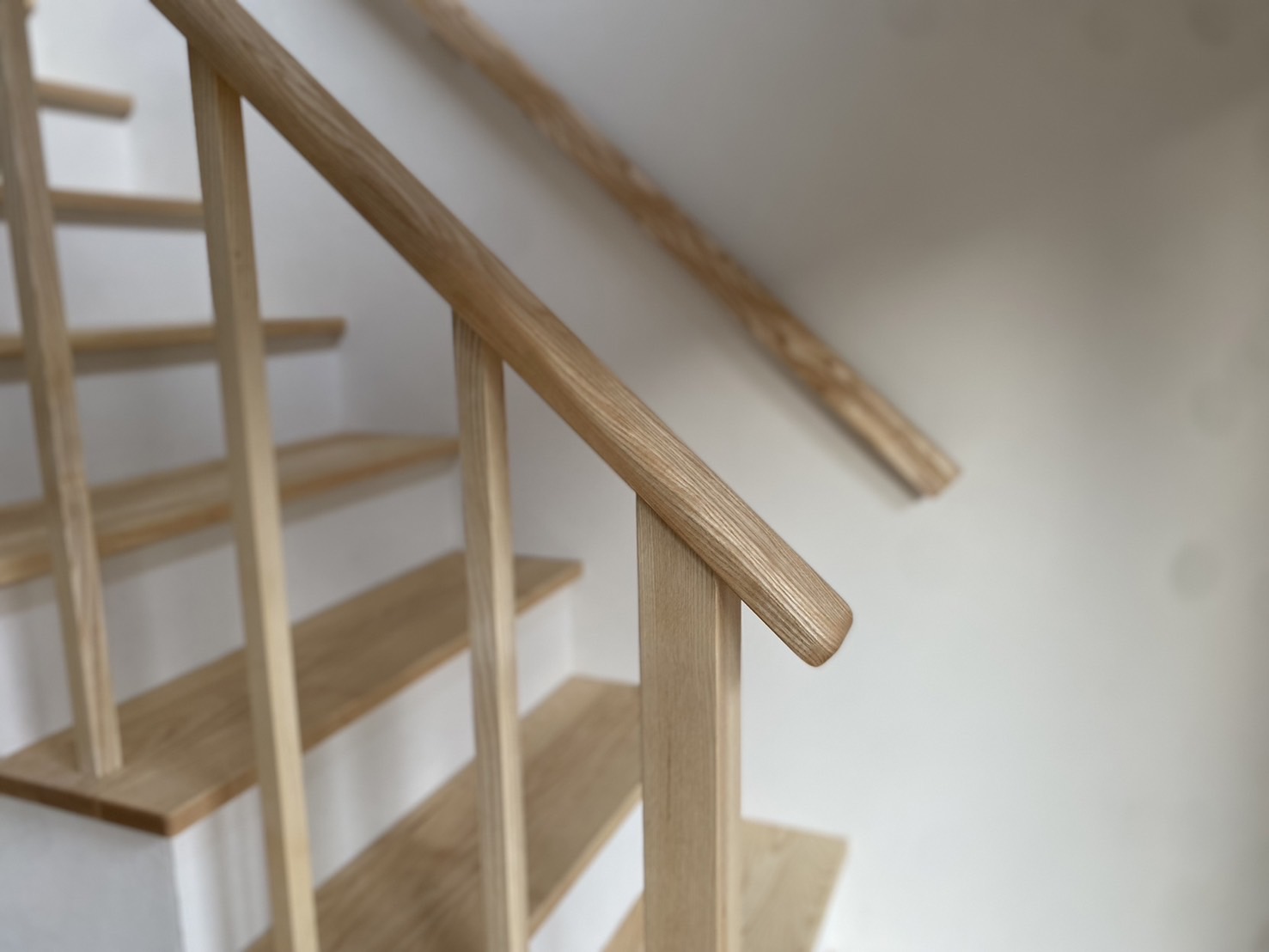 リビング階段の部材もホワイトアッシュ無垢材による造作、丁寧に加工していただいていることで手触りがとても良いです。