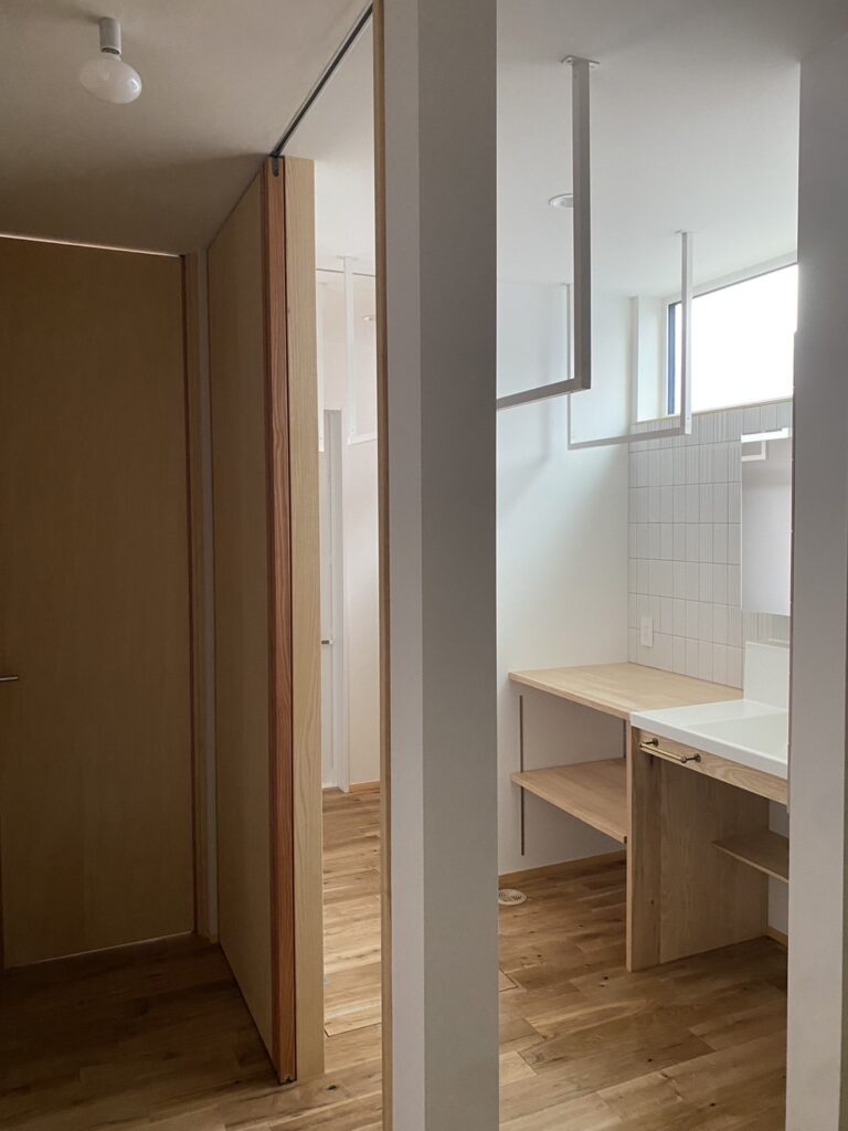 ファミリークローク、洗面洗濯室、脱衣室を連続した間取りです。