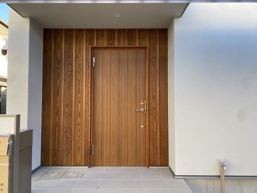 木製玄関ドアと板張りの外壁。