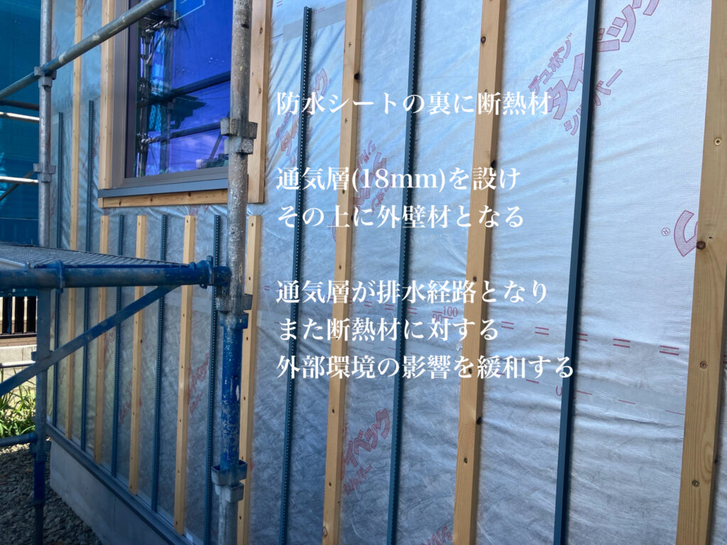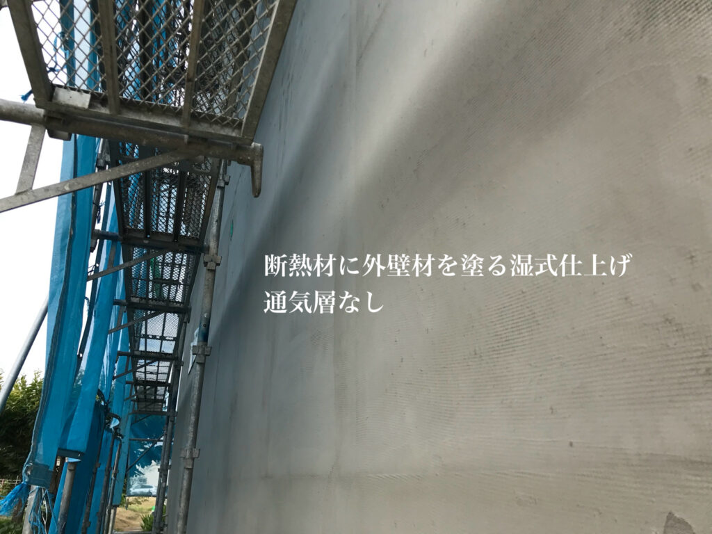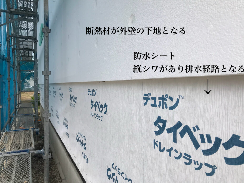 また、万一外壁が割れてしまって雨水が侵入した際に、通気層の無い湿式外断熱工法は断熱材と外壁の防水シートがほぼ密着しているため(縦にシワのある専用の防水シートがあります)排水のスピードは遅くなり、滞るリスクも否定はできないと思いました。